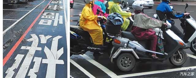 考 虑 到 起 步 时 滞留 , 绿 灯 亮 起 时,摩托车往往驶于汽车之前,故台北地区 于1997年试推“前置停车区”。如 上图右所示,在停车线前划设摩托车专用 “前置停车区”,该区域后为一般停 车线,这一措施不仅能分流汽、摩托车,保障行车安全,也实现了摩托车与 汽车的起动时间差,减少路口车流堵 塞。