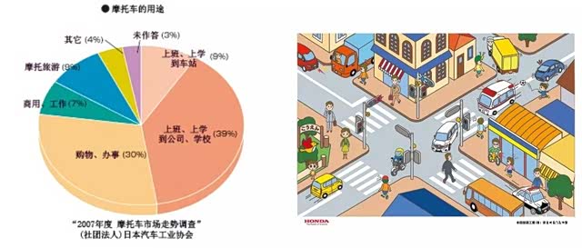 摩托车的使用目的中,80%以上是用于上班、上学、购物等生活用途。另外,用于上班、上学的摩托车中,约四分之三是作为直接去到工作单位或学校的代步工具,摩托车是极其有效的交通手段。