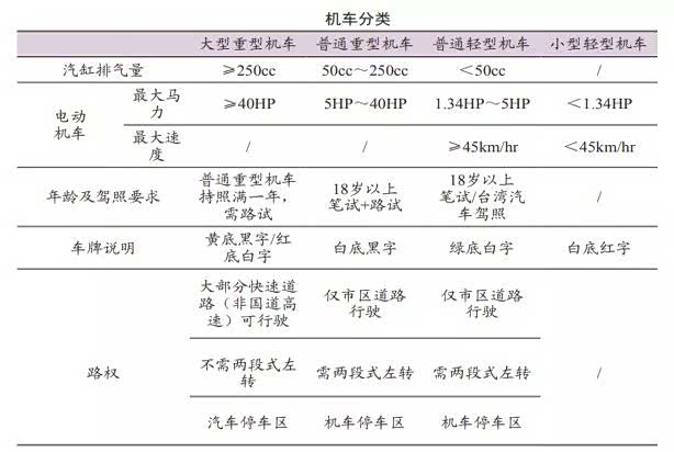 中国台湾的摩托车依照排量差异,共区分为绿牌(50cc以下)、白牌(51~250cc)、黄牌(251~550cc)与红牌(550cc以上),等四个不同的摩托车牌,同时驾照也分为轻型机车驾照、重型机车驾照与大型重型机车驾照共三种,轻型驾照只能驾驶50c.c.排量,而重型机车驾照可以驾驶250cc以下,而大型重型机车驾照则可以行驶250cc以上的大排量重车。