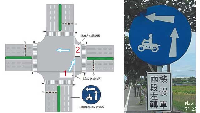 路口摩托车左转时,一般左转方易与后方直行车辆发生冲突,推出“两段式左转”措施以解决这一问题。如上图所示,相邻两处路口地面上划设矩形方框为“摩托车左转待转区”,驾驶人在第1处直行绿灯亮起时,先行驶至右前方路口的“摩托车左转待转区”等待,待第2处直行绿灯绿灯亮起时继续行驶,完成两段式左转。因“两段式左转”成效显著,主管部门于2001年修 改相关法规,要求摩托车行驶于单向三车道及以上路口必 须采取两段式左转。