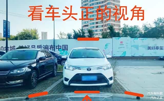还有一种方法,就是看前方车头与远处直线的平行关系。这里要注意,视角要从车头中间出发,往远处看参照物。这样才能准确判断。如果你用车头两边去观察,就会误判车是歪的。