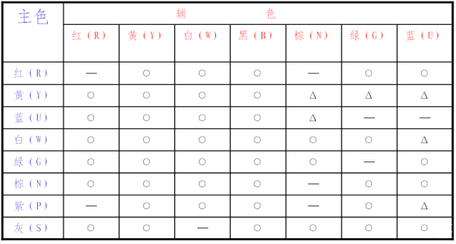 注:○-容许搭配的颜色;Δ-不推荐搭配的颜色。