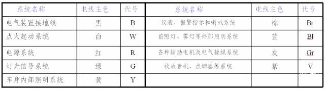 为便于安装和检修,汽车采用双色导线,主色为基础色,辅色为环布导线的条色带或螺旋色带,且标注时主色在前,辅色在后。以双色为基础选用时,各用电系统的电源线为单色,其余为双色,双色线的主色见下表。