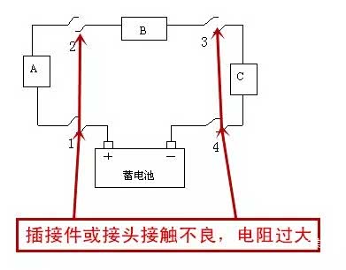 各电器系统只有电源和总开关是公共的,其他任何一个系统都应是一个完整的独立的电器回路,即包括电源、开关(保险)、电器(或电子线路)、导线等。从电源的正极经导线、开关、保险丝至电器后搭铁,最后回到电源负极。