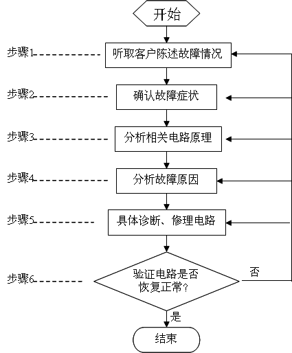 一般流程对初学者按部就班,培养良好的故障诊断与检修思路大有裨益。对于具备相当的理论知识和工作经验的维修人员,实际工作中不必过分拘泥于流程步骤,可以视实际情况或凭经验略过一些步骤,直达故障点进行检修,可有效提高工作效率。