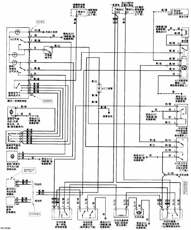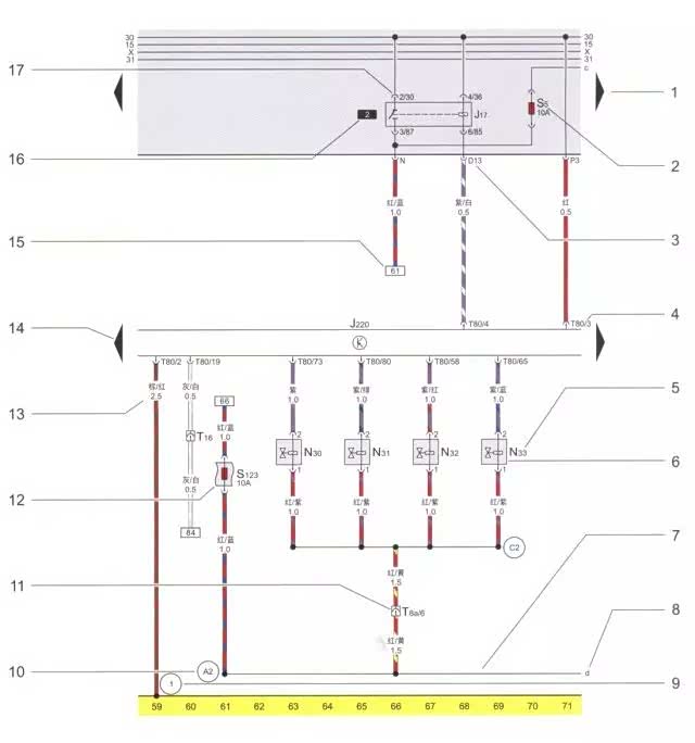 17—继电器板上的继电器或控制器接线代号,该代号表示继电器多针插头的各个触点。例如,2/30表示:2=继电器板上2号位插口的触点2,30=继电器/控制器上的触点30。
