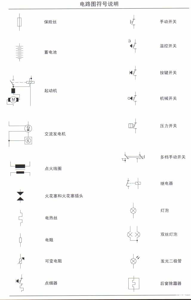 汽车电路图是利用电气图形符号来表示其构成和工作原理的。因此,必须牢记电路图形符号的含义,才能看懂电路原理图。