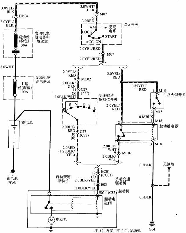 3、 找出该系统给ECU供电的电源线有哪些,注意一般ECU都不止一根电源线,弄清楚各电源线的供电状态(如常火线或开关控制)。