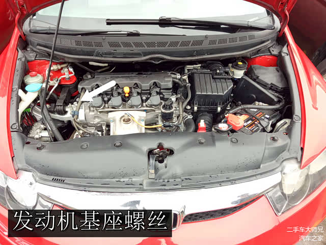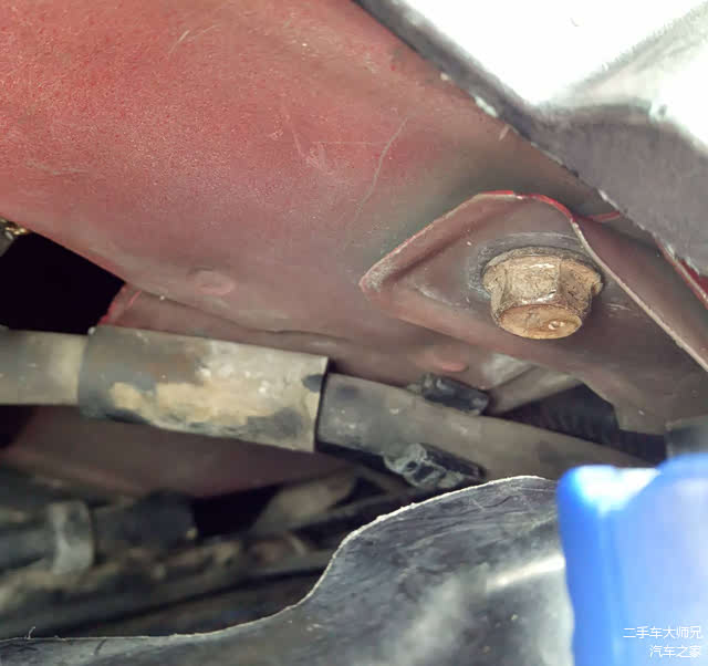 在我箭头所指方向找到发动机基座螺丝。一辆车况好的二手车发动机基座螺丝是什么样的呢?