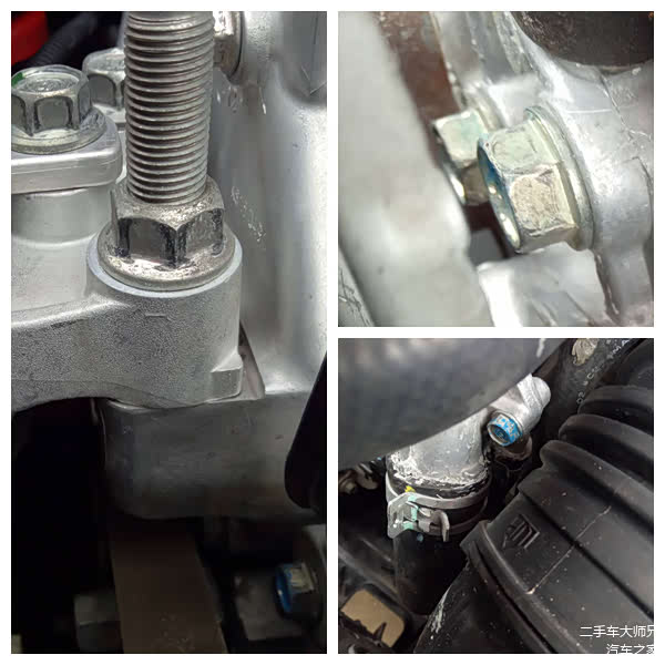 再继续检测我们发现发动机上的所有部件几乎全部拆装,水管全部重新打胶!发动机变速箱链接螺丝也拆装了!