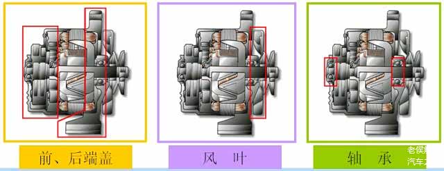 前端盖用来固定发电机,后端上装有电刷架和整流器。