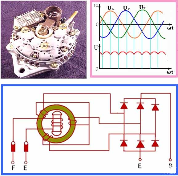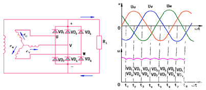 整流电路将三相电动势转变成直流脉动电压;由于蓄电池具有电容的功能,故输出的直流电压波形较平坦。