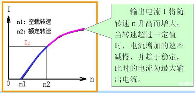 当发电机转速一定时,输出电压U随输出电流I的变化规律。
