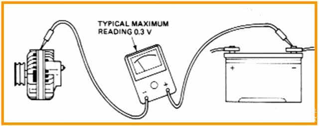 ③ 用数字万用表的直流电压档测量发电机的输出端与蓄电池的正极端之间的电压降(如图所示),正常电压值为≤0.4V。如果超过0.4V,说明导线连接点的电阻大。