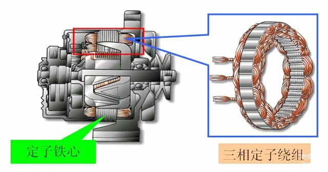 三相绕组一般采用三角形(△)和星形(Y)两种接法,定子绕组在转子产生的旋转磁场作用下,感应并输出三相正弦交流电动势。