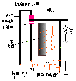 触点式电压调节器是一种机械振动式电压调节器,它利用触点的开闭作用,改变磁场电路的电阻,保持端电压的恒定。