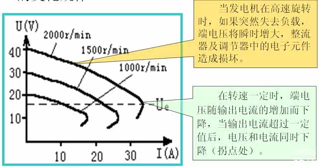 在发电机输出电压U一定时(通常12V发电机保持在14V),发电机负载电流I与转速n之间的关系称为输出特性或负载特性。