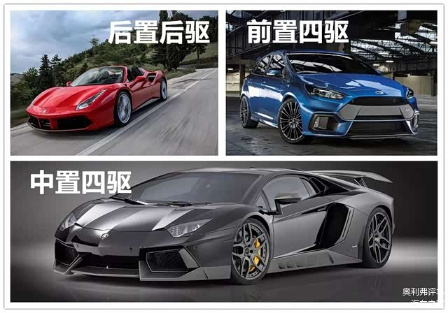 (后置后驱的法拉利488,前置四驱的福克斯RS,中置四驱的兰博基尼Aventador)