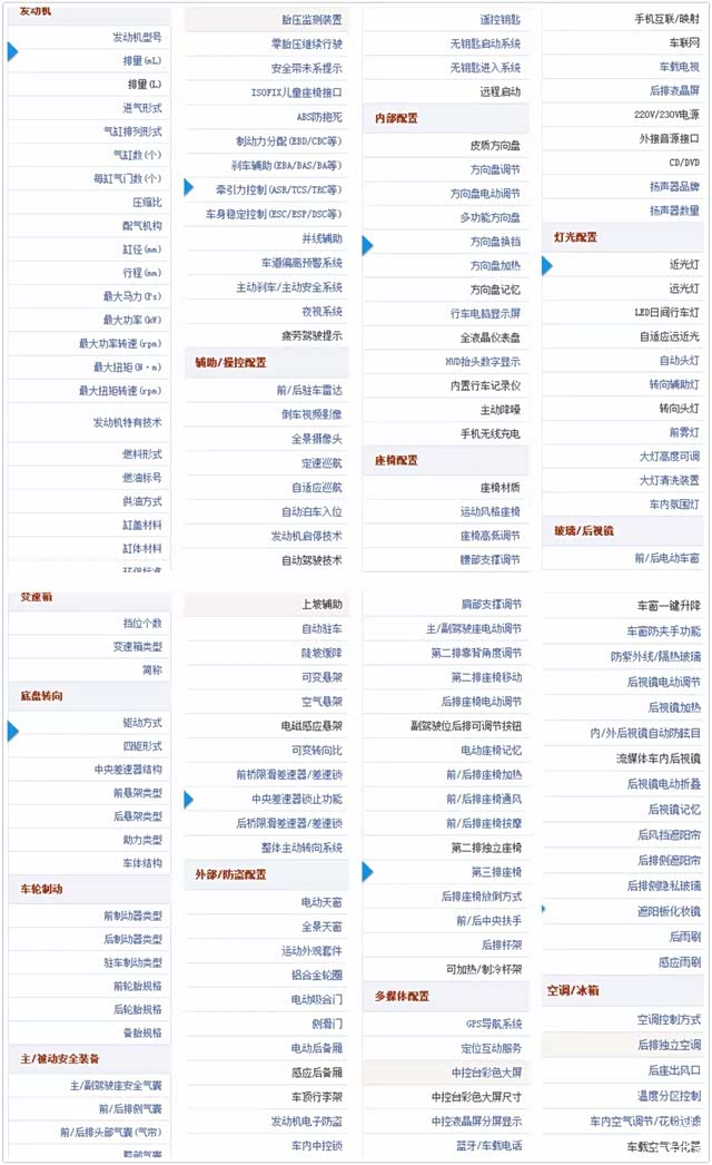 先来看一张图,这是从汽车之家找来的一般家用车会涉及到的各项配置