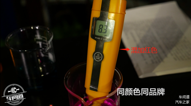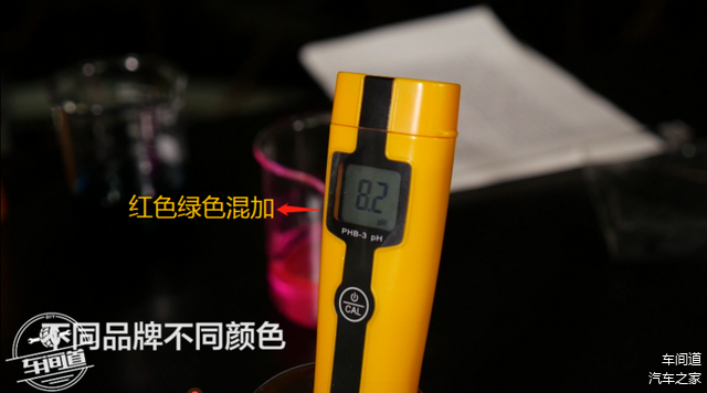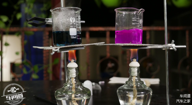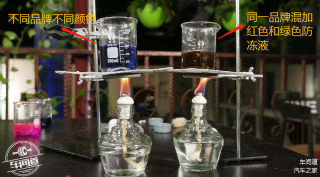 混加不同品牌同一颜色防冻液,用酒精燃烧模拟发动机里面高温状态,又加了铝片、铁、橡胶密封垫等保持实验严谨性;