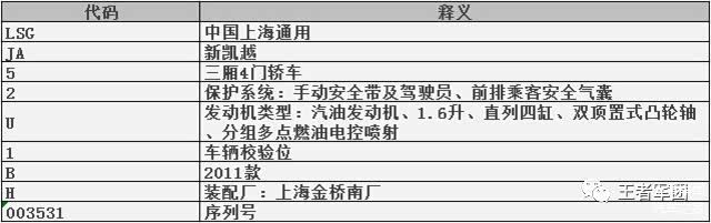 如果是小白车主的话,通过该条数据可以了解到,这是一辆2011年款的上海通用汽车。但如果有心查一下上海通用VIN的含义,就能得到以下信息。