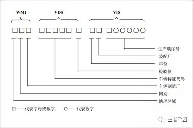 VIN总共由17位字符组成,这17位字符可分为三部分。第一部分:WMI—世界制造厂识别代码(1—3位);第二部分:VDS—车辆说明部分(4 —9位);第三部分:VIS—车辆指示部分(10 —17位)。