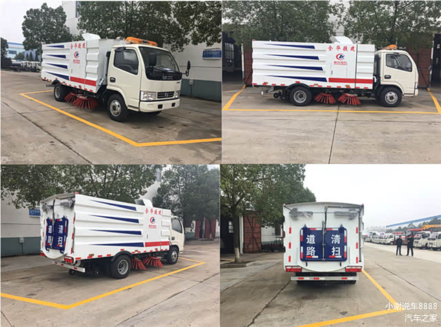 4、东风多利卡扫路车采用吸扫结合的方式收集垃圾,湿式除尘、电液控制,液压倾翻卸料的作业方式对路面进行清扫作业。