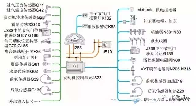 发动机转速传感器G28集成在变速箱密封凸缘上,此传感器会扫描曲轴密封法兰上的变磁阻转子环。ECU从这些信号中探测发动机转速、发动机转动方向并且与霍尔传感器G40一起探测相对于凸轮轴的曲轴位置。