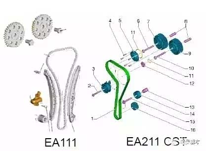 2、沿用EA111发动机的四气门技术,滚珠摇臂式气门运动机构带液压挺杆。