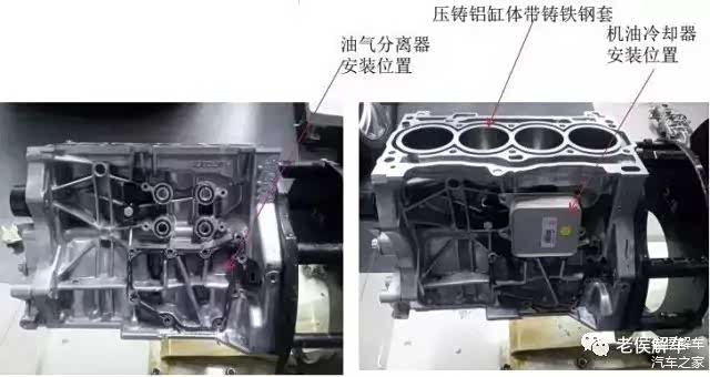 采用铝合金压铸的气缸体,集成了曲轴箱通风装置和机油冷却器,缸体内镶嵌了铸铁的缸套。铝合金压铸的油底壳中间部件集成了压缩机支点和机油滤清器支架,油底壳下部件为冲压件,油底壳上部件为塑料挡油板。