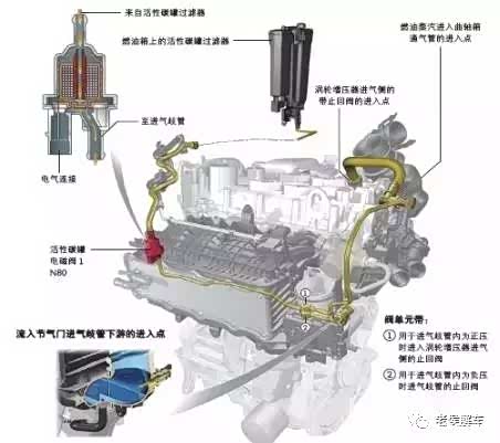 根据发动机转速的不同,燃油蒸汽以两个不同的点进入进气流。活性炭过滤器电磁阀1,N80,打开通道以流入燃油蒸汽。它是由发动机管理系统ECU进行控制的。