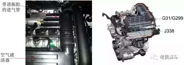 进气系统由带有谐振腔的进气管、空气滤清器、节气门控制单元、带增压空气冷却器的进气歧管及气缸盖的进气口组成。在进气系统将产生振动并将引起噪音,本发动机在进气管内设置了谐振腔能有效降低噪音。发动机控制单元通过进气压力传感器G71和进气温度传感器G42获取发动机的进气量。