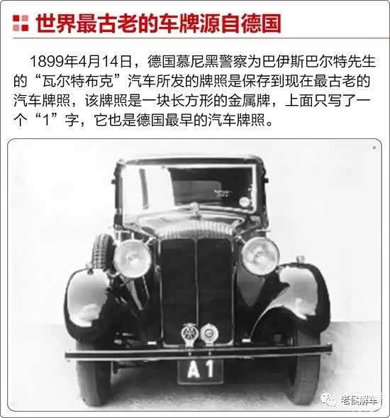 德国慕尼黑警察1899年4月14日给巴尔特先生的“瓦尔特布克”汽车所发的牌照,是保存到现在最古老的汽车牌照,也是德国最早的汽车牌照。这个牌照是一块长方形金属牌,上面只写了一个“1”字。