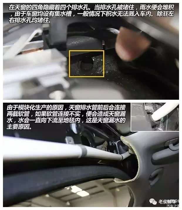 顾名思义,车辆排水孔就是雨天将车辆上的积水排出到车外的出口,原理和结构都非常简单,然而实际上很多车主用车过程中却经常忽视这些小小的排水孔,没能及时清理最终导致车内进水,严重时甚至会对车辆机械零件及电子装置造成不可逆转的损害。由于天窗排水口堵塞而导致天窗电机烧毁的案例是很多的。