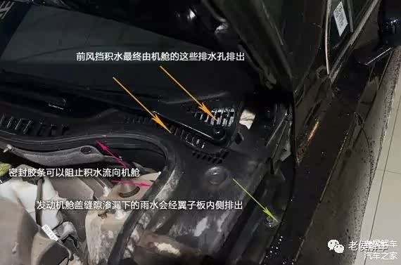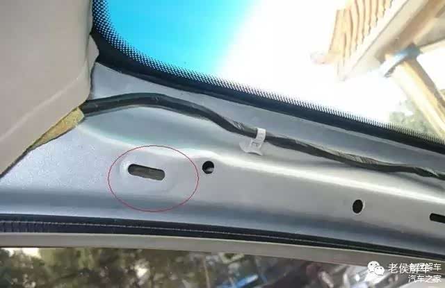 不同车型的发动机排水孔大小及布局不尽相同,位置基本都处在前风挡雨刷两侧。机舱排水口的往往也是天窗前端排水孔的末端,天窗的积水沿A柱导管流经此处,与机舱积水在翼子板内汇合后由车轮的挡泥板附近排出。(根据品牌不同,一些车型将天窗排水孔设计在车门缝隙铰链处附近)