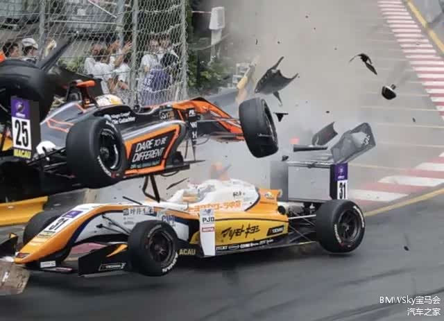 令人触目惊心的是,有一辆F3赛车在葡京弯前直路上失控,撞向弯角外侧护栏和摄影台。驾驶这辆赛车的是德国女车手索菲亚•弗洛里希(Sophia Florsch),年仅17岁,当时的最高时速达到276.2km/h,在这样的速度下失控,可想而知当时的冲击力有多大。