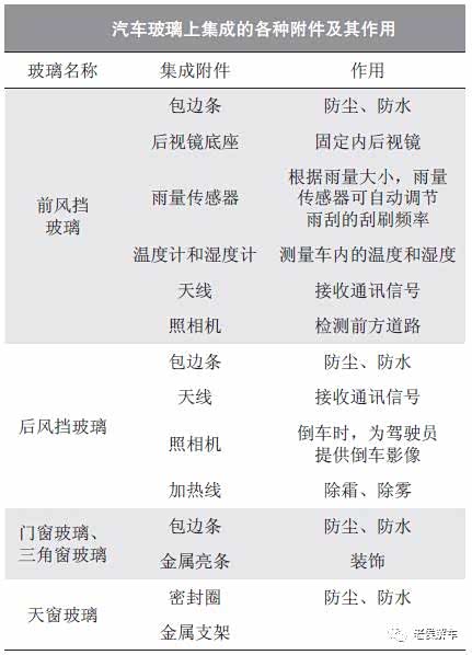 单纯的汽车玻璃已经远远不能满足消费者的要求,越来越多的附件(如天线、各种电子元件、包边条和加热线等)被集成到玻璃上(表3),可以实现接收信号、提供倒车影像、防水、防尘和加热等功能,又节省了车内空间。集成化汽车玻璃已经被越来越多各种车型所采用。