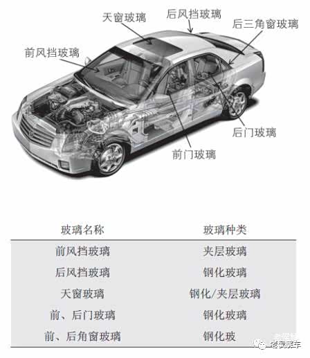 现在汽车上常用的玻璃有夹层玻璃和钢化玻璃两种,两种玻璃的应用部位如下图。