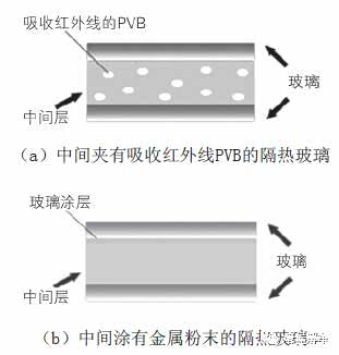 隔热/抗红外线玻璃主要有以下两种。一种是在玻璃中间的夹层采用可吸收大量红外线的PVB胶片,可以减少射入车内的太阳能量,这种玻璃的能量透过率为40%,比普通夹层玻璃低14%左右,可以有效减少空调负荷。但这种PVB胶片的价格比较昂贵,降低成本是其大面积推广的前提条件。另一种是在夹层玻璃的中间,即玻璃内表面均匀地喷洒极细的金属粉末(,使太阳能量可以被金属颗粒吸收和反射,从而达到隔热、降温的作用。这种玻璃价格比普通夹层玻璃稍贵,已经在一些高端车型(如宝马车系)上获得应用。