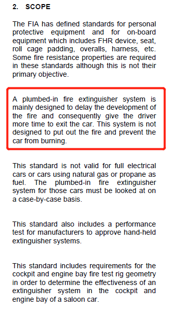 FIA关于赛车灭火器的规则中《fia_standard_8865-2015_plumbed-in_and_hand-held_fire_extinguisher_systems_-_updated_10.07.2015》第三页有明确指出:车载灭火器的目的是:用来减缓火势蔓延,增加车手逃生时间,不能彻底灭火。对于可能有燃油泄漏的车辆来说,即便是多个灭火器同时作业,也很难达到灭火的效果。