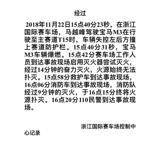 11月22日,一辆宝马M3在浙江国际赛车场烧毁,车主不幸丧身火海的噩耗在赛车圈内传开,根据相关描述,事件经过如此: