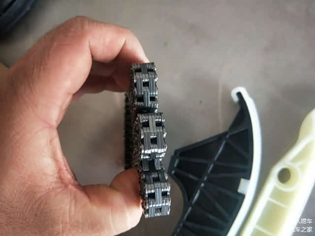 改进版正时链条,六片链,比老的多一片,自然强度更高,更不容易拉长,原厂由博格华纳代工。