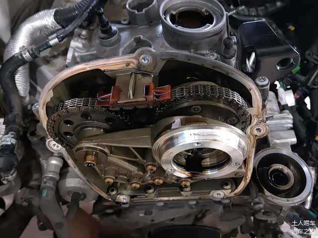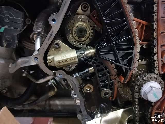 看正时链条,是五片链的老款链条,容易拉长,导致正时跳齿,这也是第二代EA888发动机的一个通病,第三代EA888已经解决。
