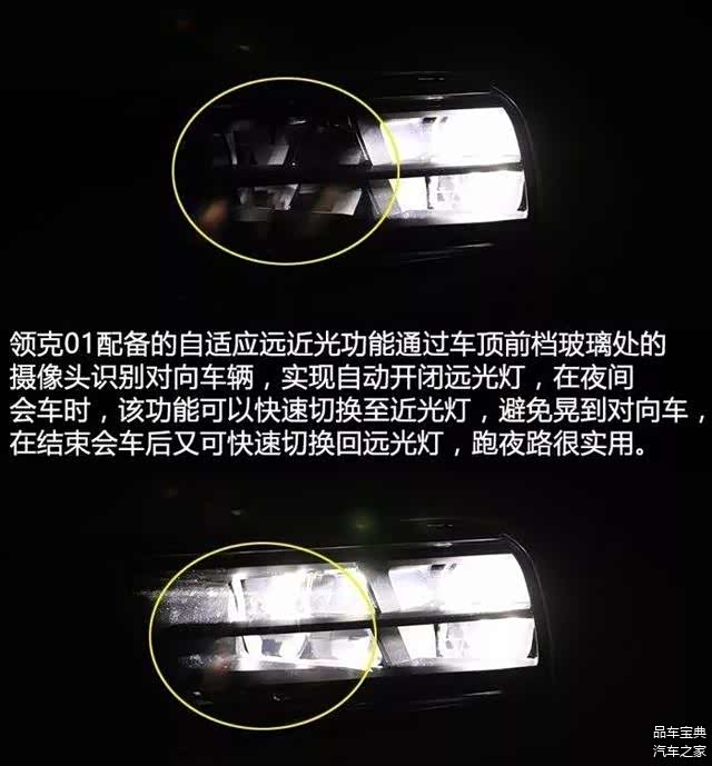 而除去雾灯,领克01的大灯也值得一说。其搭载的自适应全自动LED大灯是市面上高端车型才会配备的。不但如此,领克01的前大灯有随向转动效果,当我们打方向时,大灯会随着车身转向角度,自动变更大灯方向,保证前方道路最佳照明效果。这个科技感十足的配置,在我们夜间行车时提供了极大的安全保障,避免了我们夜间行车的盲区。这一点必须得夸一夸!