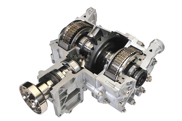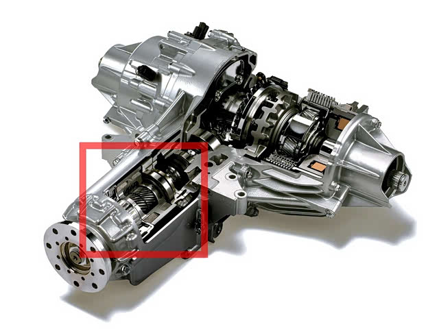 最该发力外侧后轮没有动力那怎么行,本田当然也知道,在设计之初就考虑到了这个问题,所以轮到最最最牛逼的SH-AWD出场了,这就是搭载在RL上面的初代SH-AWD。初代的SH-AWD在后离合器组中央前端具有一个变速装置,可以看做是一个2速的档位,一个档位提供正常的传动比,一个档位提供超速比,在硬转弯时,使输入的转速大于外侧后轮的转速,让外侧后轮提供驱动力。