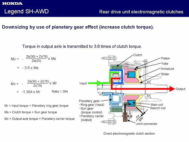 我们先从二代SH-AWD说起,其实SH-AWD已经经过了几代演变,早期的SH-AWD用料是最足的,后轴有两套行星齿轮和电磁多片离合器,左右各一套,左右两组多片离合器做动力传输以及扭矩矢量调节,行星齿轮充当中央差速器用来改变扭矩和转速 ,所以SH-AWD可以实现四轮永远有动力输出+左右后轮的扭矩分配。