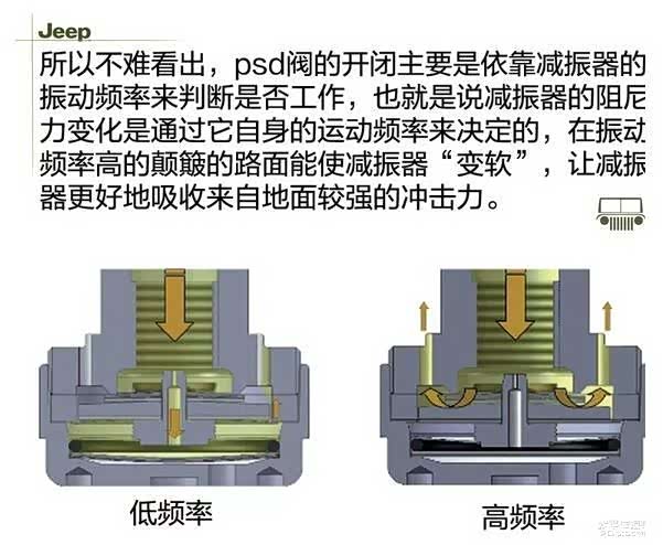 阀门A是液压触动的,由于较低的运动频率,未达到阀门A打开所需要的时间,p1与p2两处的压强相同,使得两处的液体处在一个相对较稳定的状态,也就是减振器此时很淡定,没有使用开挂模式,还是以一个比较高的阻尼状态在行驶,也就是这时的悬架比较硬。