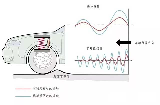 减震最直接的影响着车辆的驾驶感受。减震器并不是用来支持车身的重量,而是用来抑制弹簧吸震后反弹时的震荡和吸收路面冲击的能量。弹簧起缓和冲击的作用,将“大能量一次冲击”变为“小能量多次冲击”,而减震器就是逐步将“小能量多次冲击”减少。如果你开过减振器已坏掉的车,你就可以体会汽车通过每一坑洞、起伏后余波荡漾的弹跳,而减振器正是用来抑制这种弹跳的。没有减振器将无法控制弹簧的反弹,汽车遇到崎岖的路面时将会产生严重的弹跳,过弯时也会因为弹簧上下的震荡而造成轮胎抓地力和循迹性的丧失。