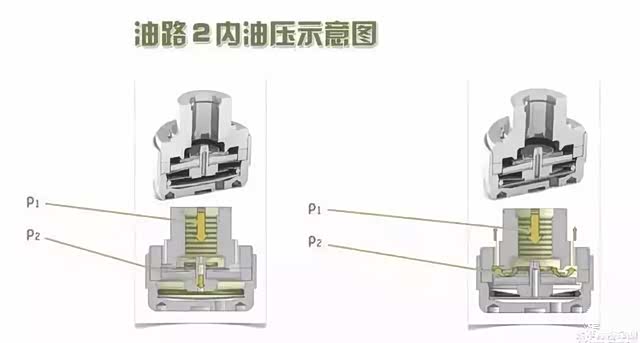 但是当减振器的震动频率过高,约7Hz左右的时候,活塞的压缩与复原所用到的时间变短,大概是不足0.15s-0.2s的时间,细小的孔径无法在更短时间内通过所有油液,此时油液堆积在油路管道内,管内的压强变大,油路2内的平衡被打破,这时的p1大于p2,阀体被下压,阀门A这时被打开,油路2通油。通过油路2的打开,减振器在复原(向上运动)的时候了多一个“泄油口”,油液就更容易流动,fsd阀就是这样使减振器“变软”的。同时,预载荷垫片会产生很小的预载荷,将阀门A置于阀门坐上,使阀门坐在复原开始的时候处于常开状态。