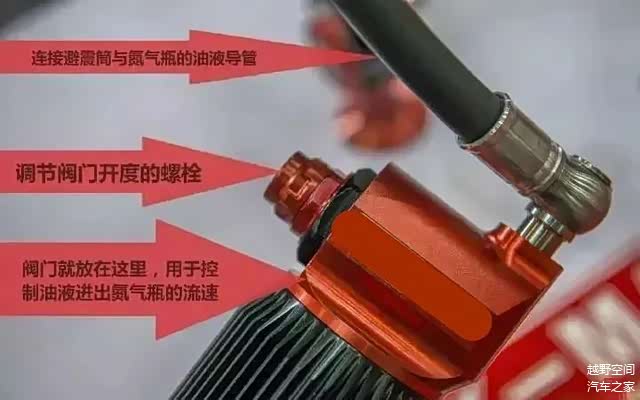 油液在筒身内受到活塞的直接作用力,通过油管导入氮气瓶中,在氮气瓶中压缩氮气,氮气瓶中又有活塞,分隔油气。这样在减震工作缸中,不再有气室,能够减轻油气混合现象。另外外置气罐的加入,使得油和气的容量得以大幅度提升,提高了减震器对悬挂的控制能力,让悬挂系统的表现更趋向于完美。